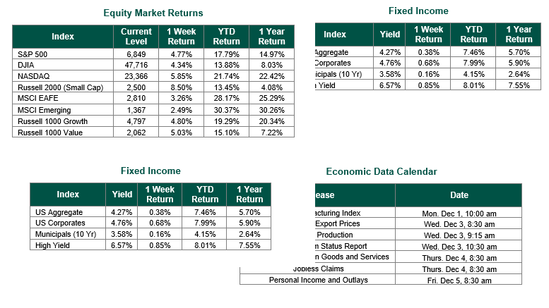 Global equity markets finished higher for the week. In the U.S., the S&P 500 Index closed the week at a level of 6849, representing an increase of 4.77%, while the Russell Midcap Index moved +2.32% last week. Meanwhile, the Russell 2000 Index, a measure of the Nation’s smallest publicly traded firms, returned 8.50% over the week. As developed international equity performance and emerging markets were positive, returning 3.26% and 2.49%, respectively. Finally, the 10-year U.S. Treasury yield moved lower, closing the week at 4.02%.