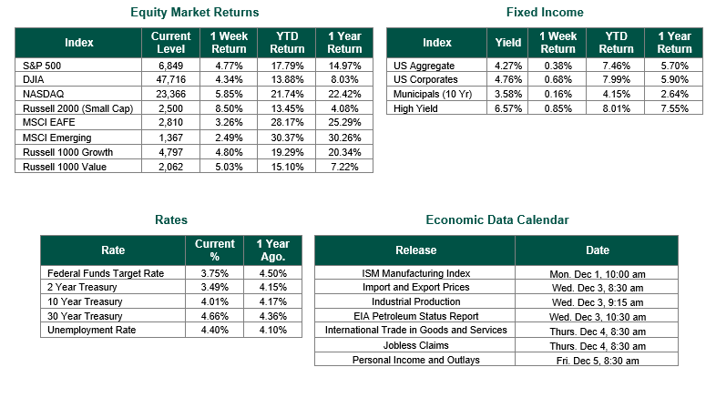 Equity and Fixed Income Index returns sourced from Bloomberg on 11/28/25. Fed funds futures was sourced from CME’s FedWatch. Consumer Confidence Index was sourced from the Conference Board. Employment Data was sourced from the Bureau of Labor Statistics. Calendar Data from Econoday as of 11/14/25. International developed markets are measured by the MSCI EAFE Index, emerging markets are measured by the MSCI EM Index, and U.S. Large Caps are defined by the S&P 500 Index. Sector performance is measured using the GICS methodology.