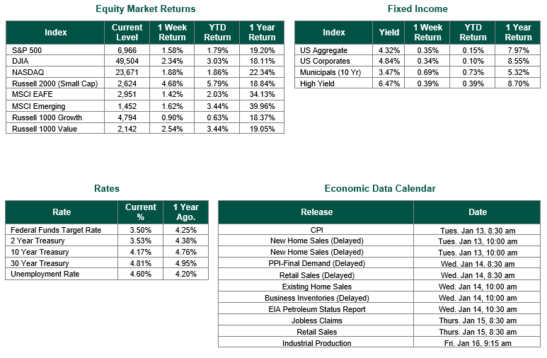 Equity and Fixed Income Index returns sourced from Bloomberg on 1/9/26. The JOLTS and Employment Situation reports were sourced from the Bureau of Labor Statistics. Weekly Jobless Claims were sourced from the U.S. Department of Labor. Trade deficit data was sourced from the Commerce Department. Calendar Data from Econoday as of 1/9/26. International developed markets are measured by the MSCI EAFE Index, emerging markets are measured by the MSCI EM Index, and U.S. Large Caps are defined by the S&P 500 Index. Sector performance is measured using the GICS methodology.