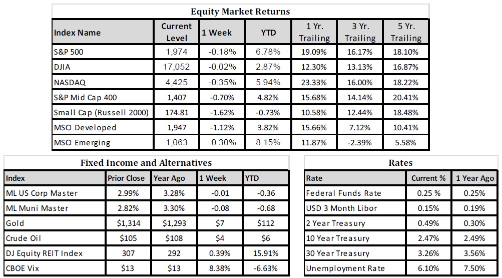 Sources: Rates Data —Bloomberg Markets as of 7/21/14; Equity Market Returns and Fixed Income and Alternatives Data—Wells Fargo Advisers as of 7/21/14