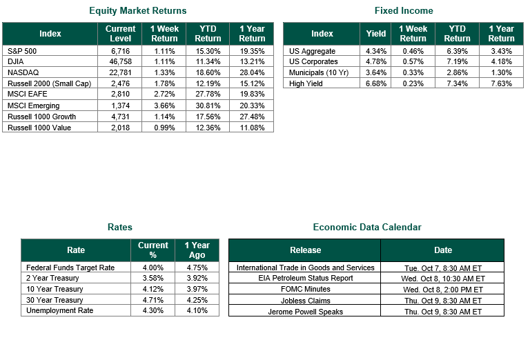 Global equity markets finished higher for the week. In the U.S., the S&P 500 Index closed the week at a level of 6,716, representing a gain of 1.11%, while the Russell Midcap Index moved 0.77% higher last week, closing near 3,713. Meanwhile, the Russell 2000 Index, a measure of the nation’s smallest publicly traded firms, returned 1.78% over the week. Developed international equities were strong, with the MSCI EAFE Index returning 2.72%, while emerging markets outperformed, as the MSCI Emerging Markets Index gained 3.66%. Finally, the 10-year U.S. Treasury yield moved higher, closing the week at 4.12%.