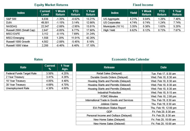 Equity and Fixed Income Index returns sourced from Bloomberg on 2/13/26. Retail Sales data was sourced from the Commerce Department. Employment Data and the Consumer Price Index (CPI) was sourced from the Bureau of Labor Statistics. Weekly Jobless Claims are sourced from the U.S> Department of Labor. Fourth quarter earnings data was sourced for Fact Set. Calendar Data from Econoday as of 2/13/26. International developed markets are measured by the MSCI EAFE Index, emerging markets are measured by the MSCI EM Index, and U.S. Large Caps are defined by the S&P 500 Index. Sector performance is measured using the GICS methodology.