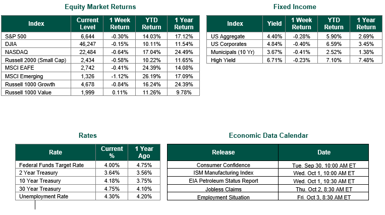 Equity and Fixed Income Index returns sourced from Bloomberg on 9/26/25. GDP and PCE Data sourced from the Bureau of Economic Analysis on 9/25/25 and 9/26/25, respectively. Jobless claims sourced from the U.S. Department of Labor on 9/26/25. International developed markets are measured by the MSCI EAFE Index, emerging markets are measured by the MSCI EM Index, and U.S. Large Caps are defined by the S&P 500 Index. Sector performance is measured using the GICS methodology.