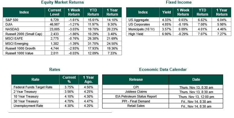 Looking ahead, attention will shift to the reopening of government agencies and the return of key economic data releases, which should offer a clearer view of U.S. growth trends heading into year-end. Investors will also be monitoring inflation updates and corporate earnings—especially from leading technology and AI-focused firms—for insight into whether recent market softness signals a temporary pause or a broader shift in momentum. Overall, while volatility may persist in the short term, the government’s reopening and continued economic resilience could help restore confidence as the year closes.