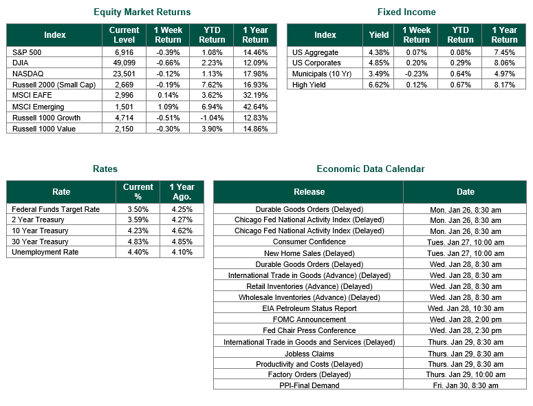 Equity and Fixed Income Index returns sourced from Bloomberg on 1/23/26. GDP and PCE data were sourced from the Bureau of Economic Analysis. Weekly Jobless Claims were sourced from the U.S. Department of Labor. PMI data was sourced from S&P Global. Consumer Sentiment data was sourced from the University of Michigan. Fourth quarter earnings data was sourced for Fact Set. Calendar Data from Econoday as of 1/23/26. International developed markets are measured by the MSCI EAFE Index, emerging markets are measured by the MSCI EM Index, and U.S. Large Caps are defined by the S&P 500 Index. Sector performance is measured using the GICS methodology.