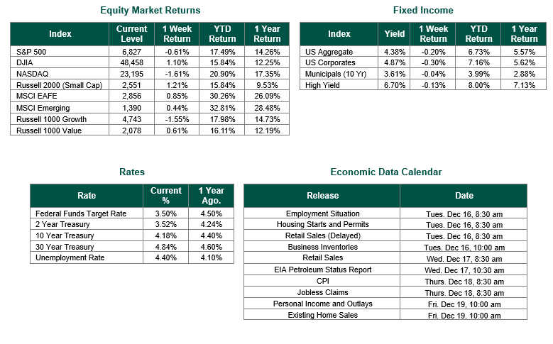Equity and Fixed Income Index returns sourced from Bloomberg on 12/12/25. Jobless Claims sourced from the US Department of Labor on 12/11/25. JOLTS data sourced from the Bureau of Labor Statistics on 12/9/25. Calendar Data from Econoday as of 12/15/25. International developed markets are measured by the MSCI EAFE Index, emerging markets are measured by the MSCI EM Index, and U.S. Large Caps are defined by the S&P 500 Index. Sector performance is measured using the GICS methodology.