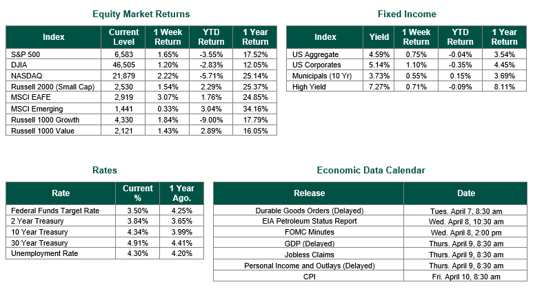 After five consecutive weeks of losses and the longest losing streak since 2022, markets finally caught a bid. The S&P 500 rose 3.4% on the week, the Dow added nearly 3%, and the Nasdaq surged 4.4%, marking the first weekly gain for all three major indexes since the Iran conflict began. The rally was broad-based, with technology leading the recovery after weeks of disproportionate selling. It was a holiday-shortened week, with markets closed Friday in observance of Good Friday, yet the March jobs report was released Friday morning, but markets won’t be able to fully react until Monday.